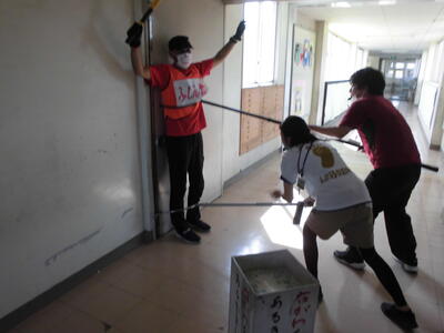 (子供たちの安全を守るため、不審者侵入を止めたり、動きをおさえたりする教員の訓練もおこないます。)
