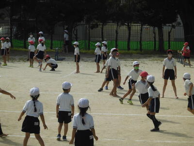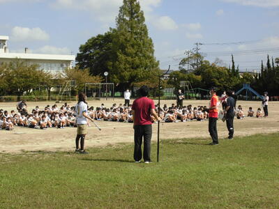 (不審者が警察に引き渡された想定で、全校児童が校庭に避難しました。)