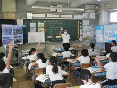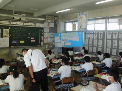 ( ↓ 3年生の社会科の授業です。お米を作る仕事について学習しています。教育実習の二人も参観しています。)