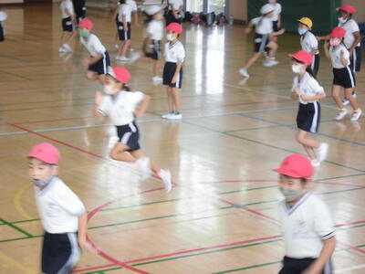 いよいよ今週末は運動会です。雨天のため、体育館で、低学年(1・2年生)が合同で練習をおこなっています。