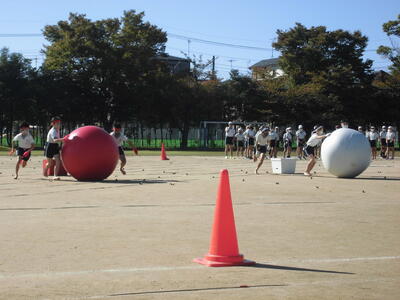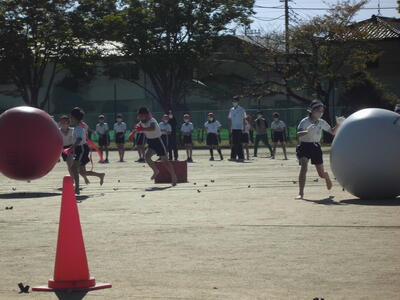 全校が紅組・白組わかれての「大玉送り」です。実際に競技をおこなってみます。