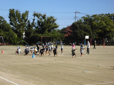 ( 感染症対策で、児童同士の間隔をあけておこなっています。)