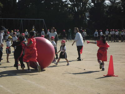 9:55 全校児童が、紅組・白組に分かれての大玉送りです。