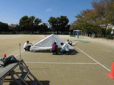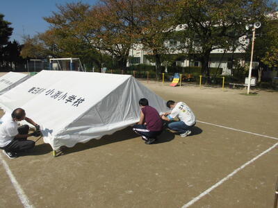 午前中から、おやじの会の方にお手伝いいただきました。道具の運搬、クイ打ち、ロープ張り、テント設営、などおこなっていただき、おかげで午後の作業をスムーズに進めることができます。