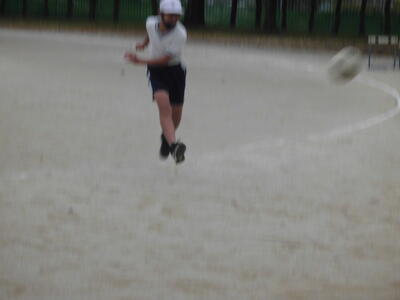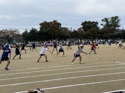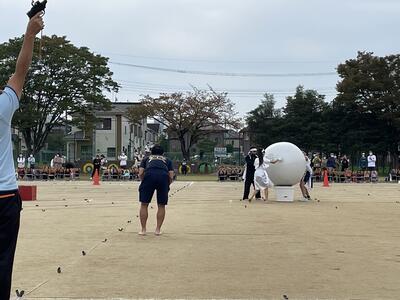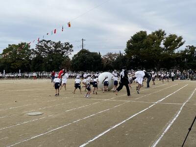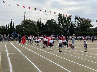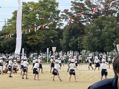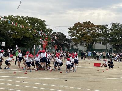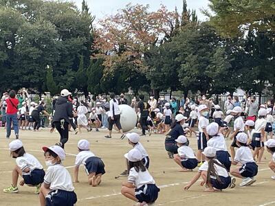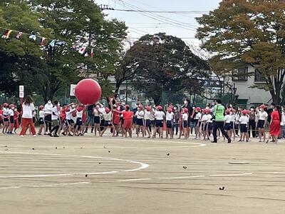 9:55 全校児童が、紅組・白組に分かれての大玉送りです。