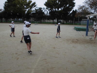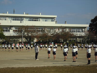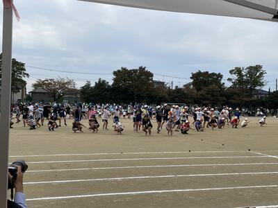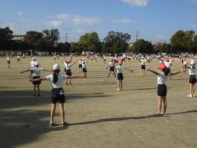 ( ↓ 運動委員が前に出て、走る前の準備体操です。)