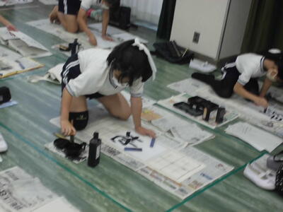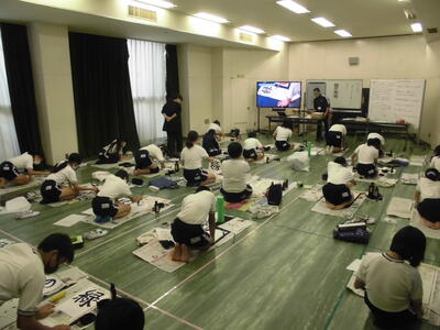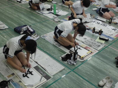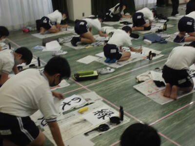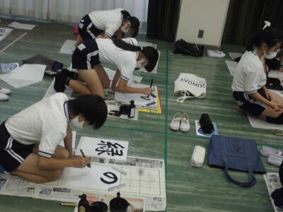 5時間目の6年生の書写の時間です。習字で『緑の大地』の文字を書きます。