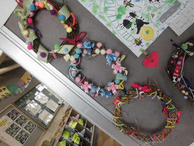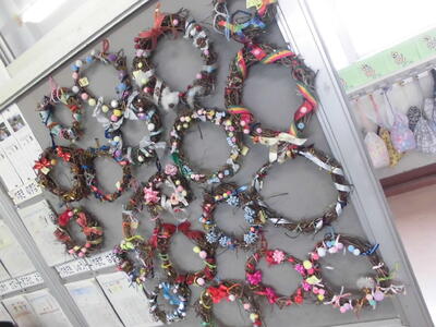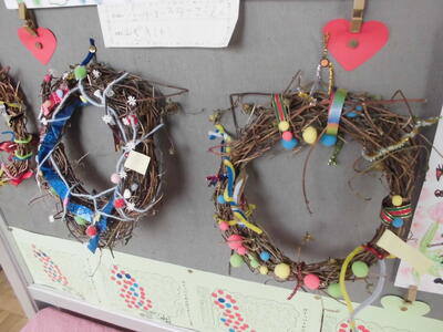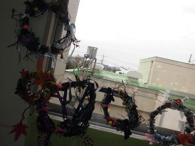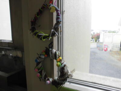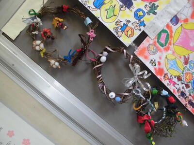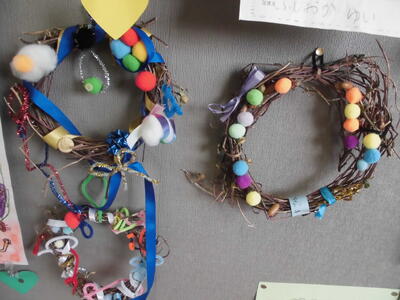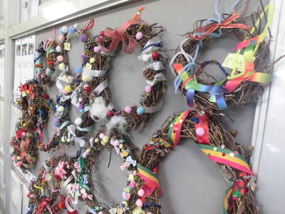 ( ↓ 一年生が作ったリース。教室の壁や廊下に飾られています。)