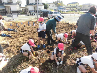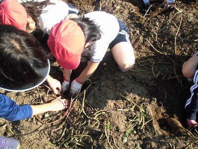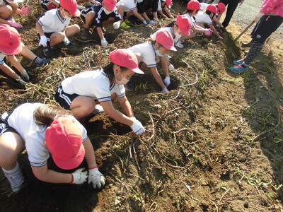 最初に3年生が掘り始めました。学校でのイモ掘りも3回目となり、どんどんイモを見つけて掘っていきます。