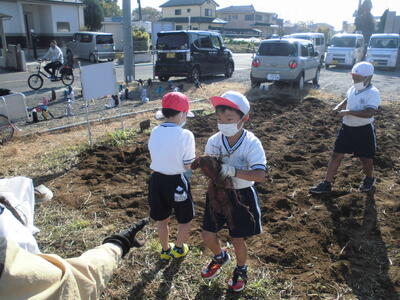 次の一年生がやってきました。小学校で初めてのイモ掘りに挑戦します。
