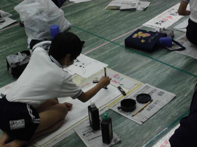 5年生の書写の時間です。書きぞめ(毛筆)に取り組んでいます。