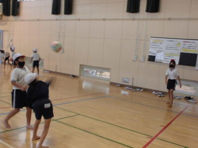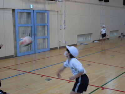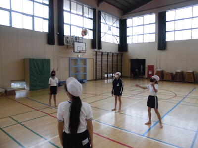 ( ↑ 円陣パスの練習をしています。相手の名前を呼んでパスを回しています。)