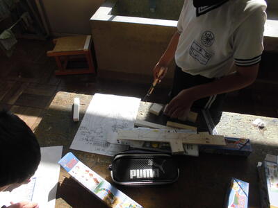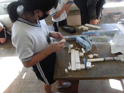 4年生の図工の時間です。木材を加工して作品を作ります。