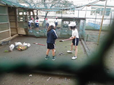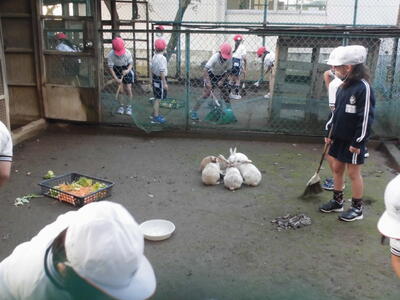 ウサギのお世話を低学年の子供たちがおこなっています。この時期は、一年間お世話をしてきた二年生から、一年生へとウサギ当番の仕事が引き継がれます。