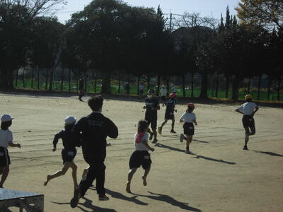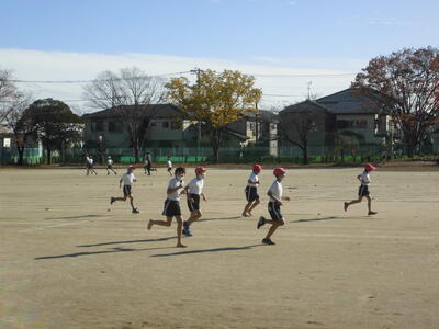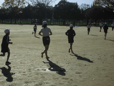 ( ↓ 多くの児童が自主的に校庭を走っています。)