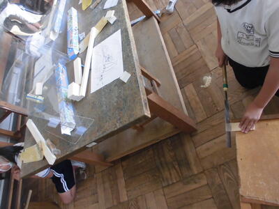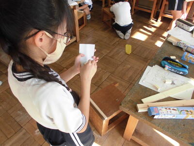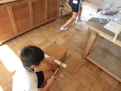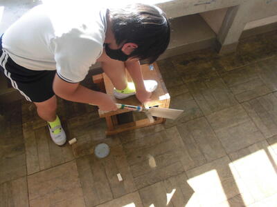4年生の図工の時間です。木材を加工して作品を作ります。