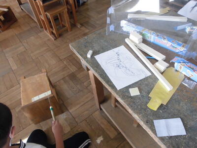 ( ↓ できあがる作品のイメージを、設計図に書いています。)