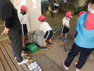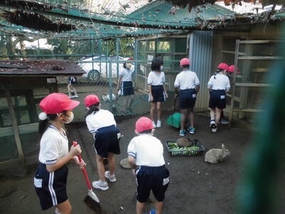 ウサギのお世話を低学年の子供たちがおこなっています。この時期は、一年間お世話をしてきた二年生から、一年生へとウサギ当番の仕事が引き継がれます。