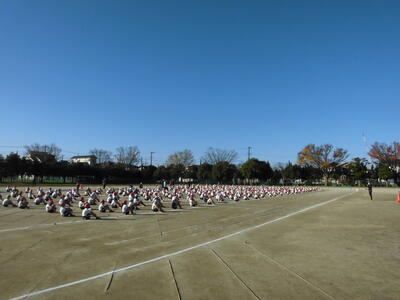 10:35 中学年が集まりました。準備運動などを行います。3、4年生は1000メートルを走ります。