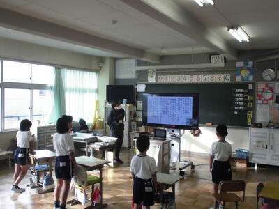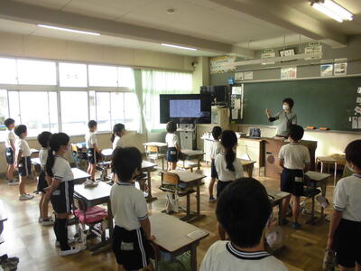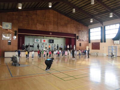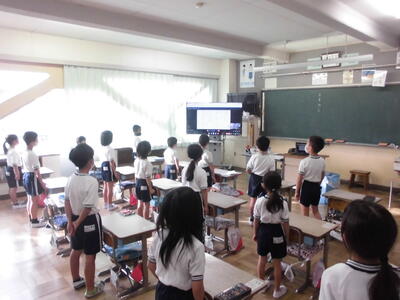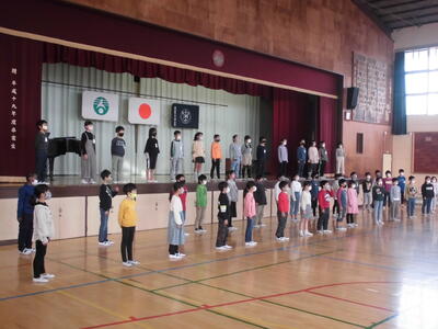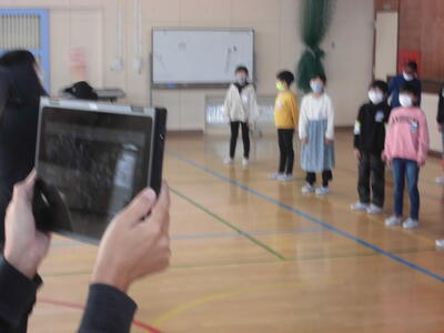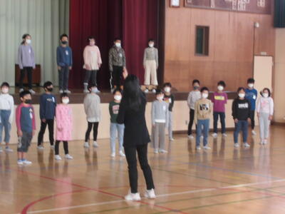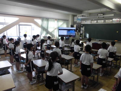 今日の朝は音楽朝会でした。体育館で3年生が今月の歌を発表しました。感染症対策のため、体育館と各教室をリモートでつないでおこないました。