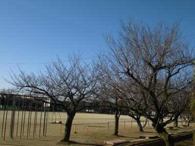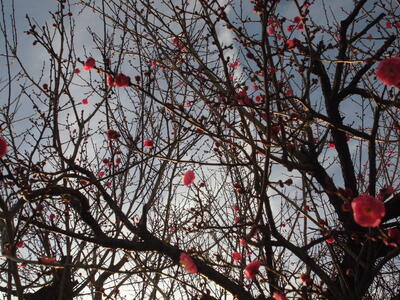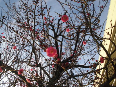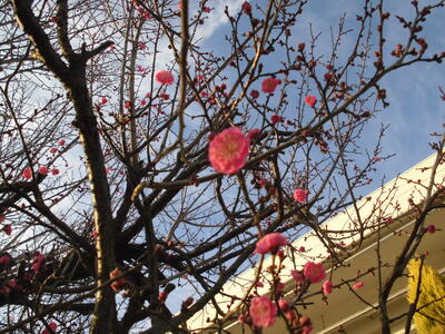 学校の梅の木に赤い花が咲き始めました。まだまだ寒い冬が続きますが、青い冬空に赤い花が映えています。