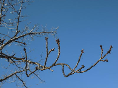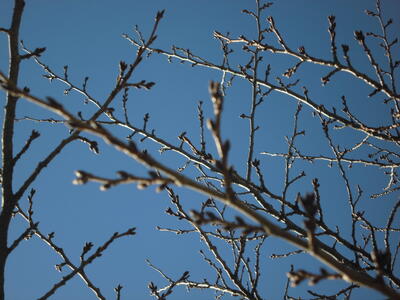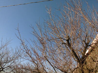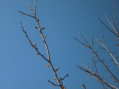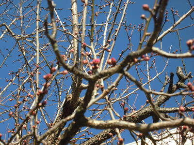 学校のある梅の木の枝には、花のつぼみがついてきました。