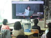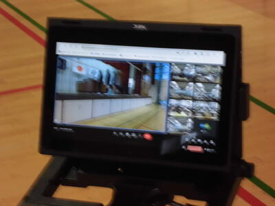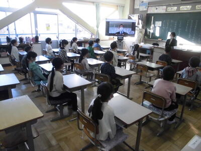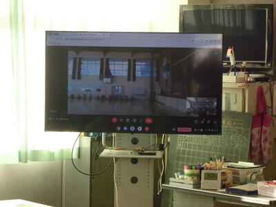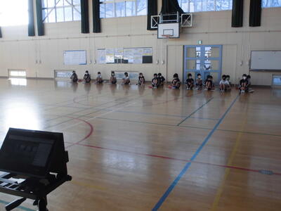 ( ↓ 体育館の様子を、全校児童が教室のモニターで見ています。)