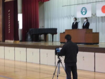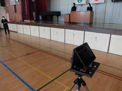 今日の朝は表彰朝会です。感染症対策のため、体育館と各教室をリモートでつないでおこないました。