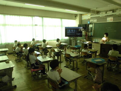 ( ↓ 表彰の様子は、各教室のモニターで子供たちが見ています。)