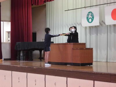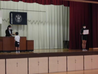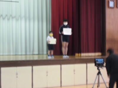 ( ↓ 続いて、持久走大会の各学年の6位までが表彰されます。体育館では、1位の児童が代表して賞状を受け取りました。他の児童は、名前を呼ばれて自分の教室で起立しています。)