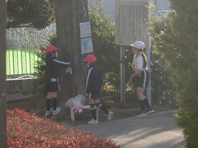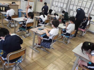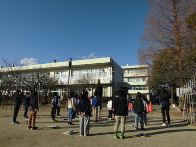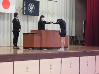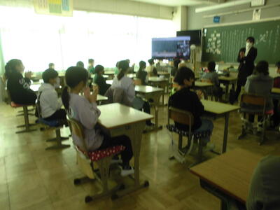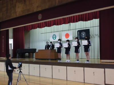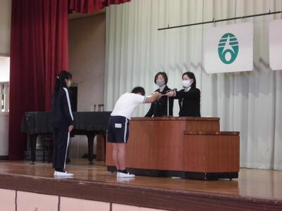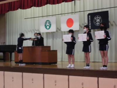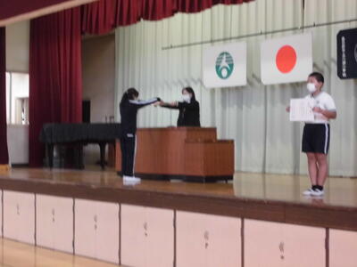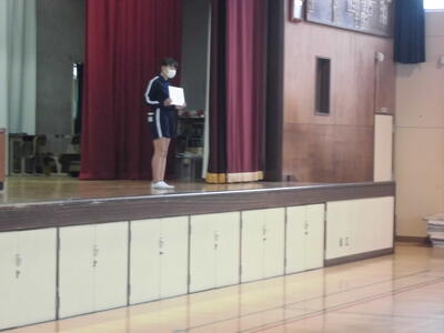 今日の朝は体育朝会、持久走関係の表彰がありました。感染症対策のため、体育館と各教室をリモートでつないでおこないました。