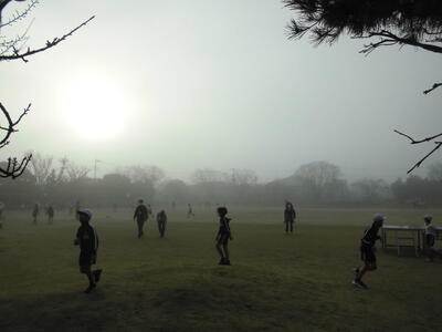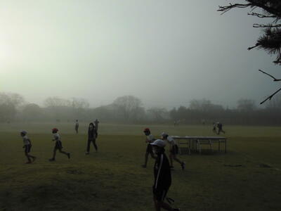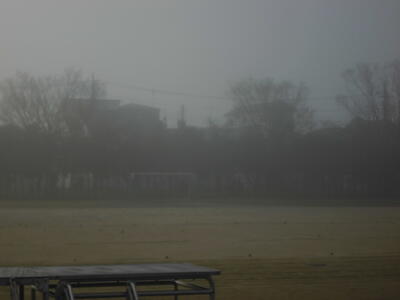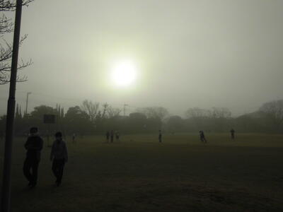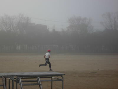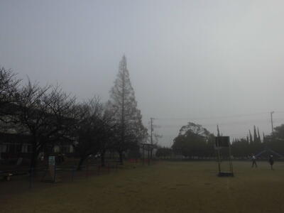 ( ↓ 霧の中、校庭に出て活動する子供たち。)