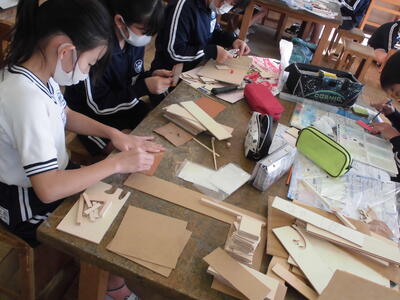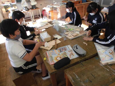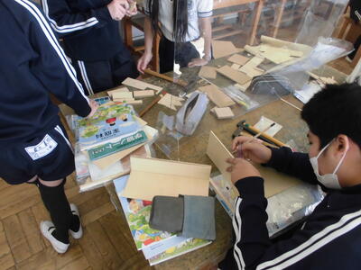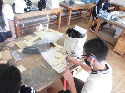 ↓ 6年生の図工の授業です。木工で、自分のデザインした収納ケースや本箱などを作っています。