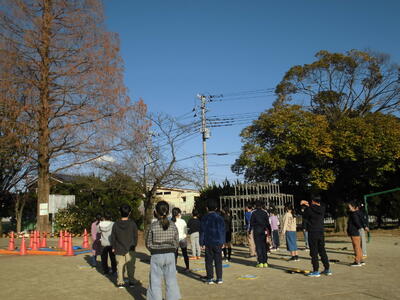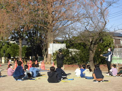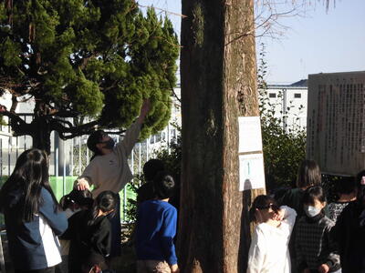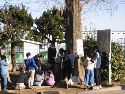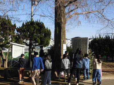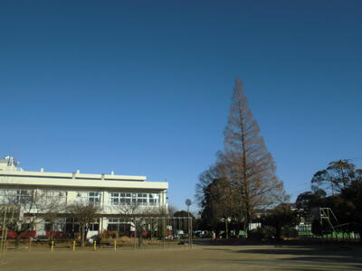 メタセコイヤの木を前にして、3年生が校庭で授業をおこなっています。