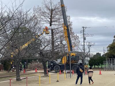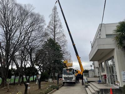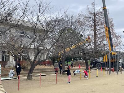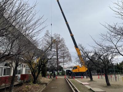 お知らせしてきましたメタセコイヤの木の伐採の当日となりました。朝から、作業車や重機などが学校で準備をしています。