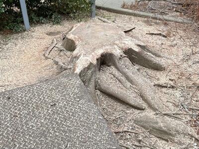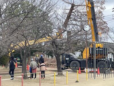 9時53分、幹の根元の伐採が終了しました。切り株を残して、メタセコイヤの木とはお別れとなりました。