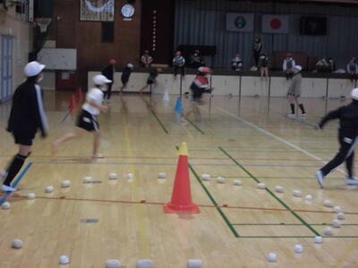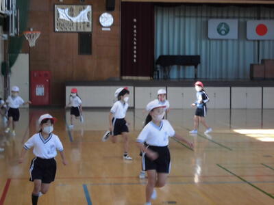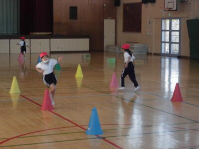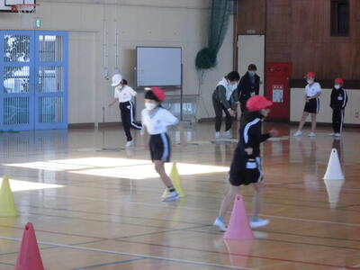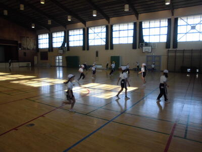 ↓ 一年生の別のクラスです。ゲーム的要素を取り入れて、体育館で元気に運動しています。