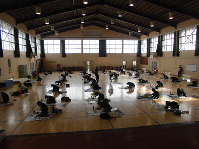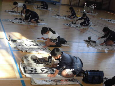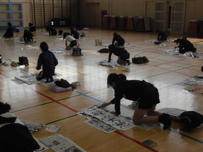 ( ↓ 体育館での6年生の様子。『緑の大地』の文字に取り組んでいます。)