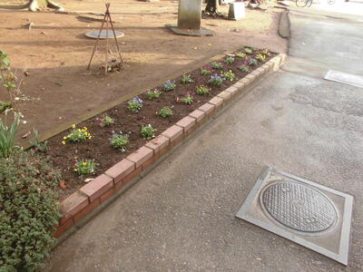 冬休み4日目です。学校の玄関前の花壇に花が植えられています。教務主任の先生や校務員さんが土を耕し、校長先生が花を植えました。いずれ花がきれいに咲いて、来校された方を出迎えるようになります。