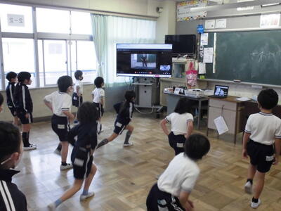 ( ↓ 朝の校庭での「さわやかタイム」は中止にして、各クラスをリモートでつないで、室内で運動やダンスをおこないました。)