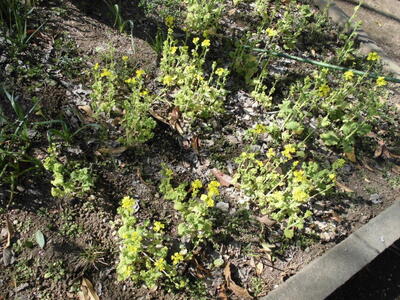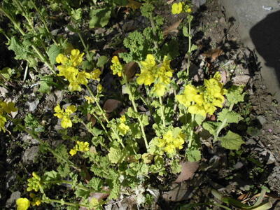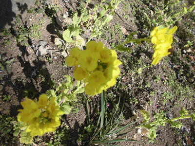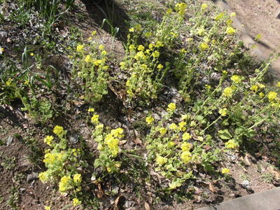 学校の花壇では、菜の花がきれいに咲いています。春が近づいています。