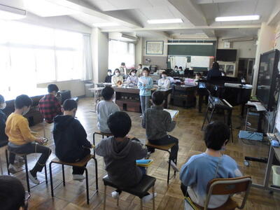 ( ↑ 講師の方の問いかけに挙手でこたえています。)