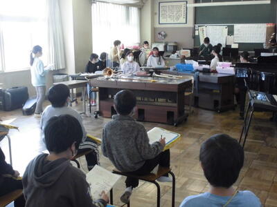 はじめに器楽クラブが合奏を披露して、全校児童で聞きました。