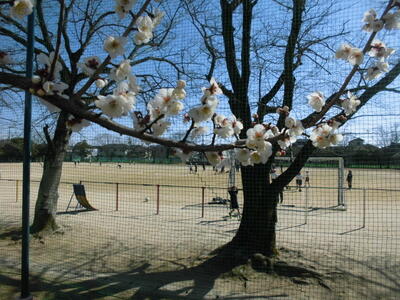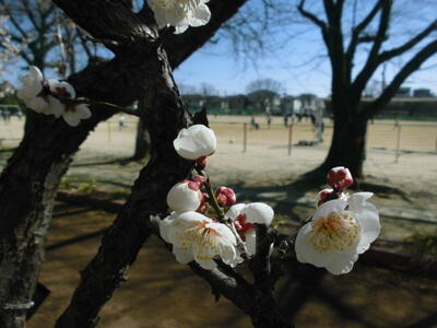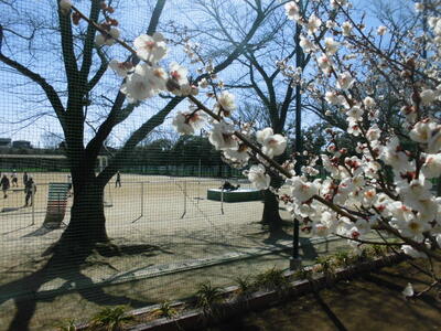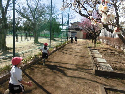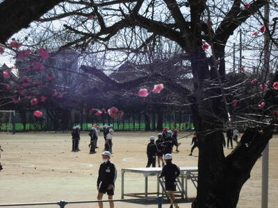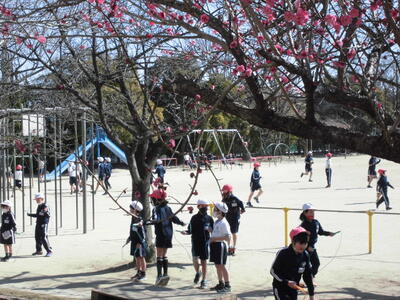 今日の昼休みです。校庭の横に咲いている白と紅の梅の花が子供たちを見守っているかのようです。