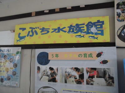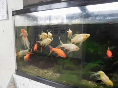 ( ↓ 児童棟と管理棟の間の小渕水族館。金魚やメダカが元気に泳いでいます。美化委員が世話をしたり、水槽をきれいにしてくれたりしています。)