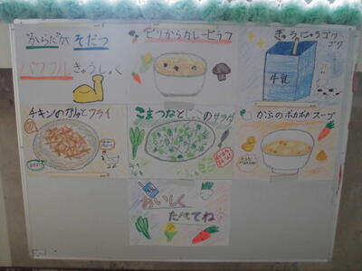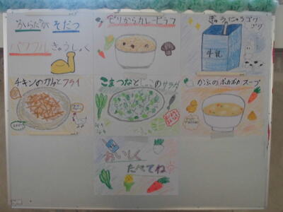 ( ↓ 給食室前には、今日の献立がイラスト入りで紹介されています。)