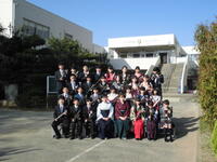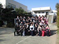 ( ↓ 朝、正門前で最後のクラス集合写真を撮ります。)
