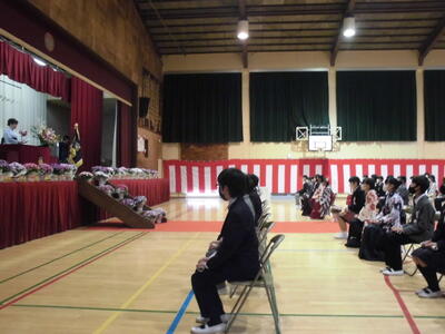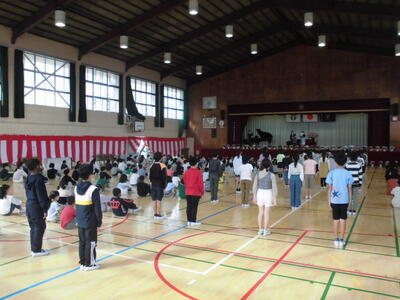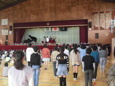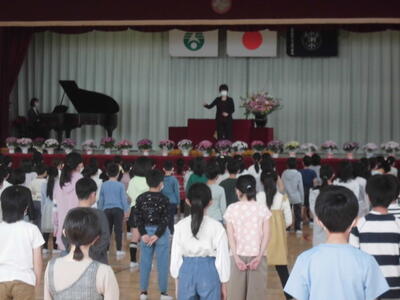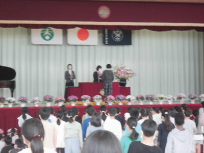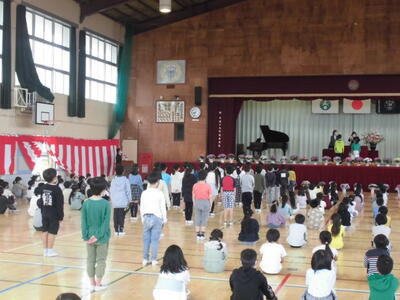 ( ↓ 校歌の合唱です。きれいな歌声が体育館に響いています。)