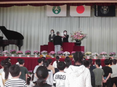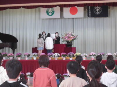 ( ↓ たくさん本を読んだ「本いっぱい」、たくさん校庭を走った「汗いっぱい」の表彰です。代表児童が賞状を受け取ります。)