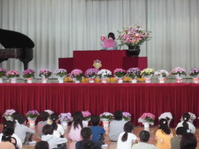 ( ↓ 各学年に修了証が渡されます。学年ごとに起立して、代表児童が壇上で受け取ります。)
